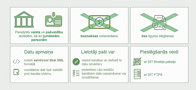 Datu izplatīšanas tīkls ir valsts un pašvaldību sistēmās integrējams centralizēts risinājums, kurā iestādes var reglamentēt sadarbību starp to informācijas sistēmām (IS). Iestāžu (kas ir reģistrētas VISS klasifikatorā) IS var apmainīties ar iepriekš noteikta XML formāta ziņojumiem. Komunikācija notiek, izmantojot virtuālus kanālus, kur notiek primāro ziņojumu (ziņojumi ar biznesa datiem) un kļūdas paziņojumu (speciāla veida informācijas ziņojums par kļūdām biznesa datos) sūtīšana. Katram kanālam ir viens īpašnieks – iestāde, kas veido kanālu, un 0..N dalībnieki – iestādes, kurus īpašnieks iestāde pieslēdz kanālam, kuru tā ir izveidojusi.