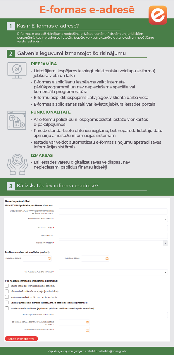 E-formas e-adresē ir risinājumus, kas nodrošina privātpersonām (fiziskām un juridiskām personām), kuri ir e-adreses lietotāji, iespēju veikt strukturētu datu ievadi un nosūtīšanu valsts iestādēm oficiālas elektroniskās adreses likuma izpratnē. Risinājums ir kā platforma, kas iestādēm ļauj bez papildus finanšu līdzekļu piesaistes digitalizēt veidlapas (turpmāk – e-formas). Tādējādi ar e-formu palīdzību ir iespējams nodrošināt Iestāžu vienkāršo e-pakalpojumu izpildi, kas paredz datu iesniegšanu, bet neparedz lietotāja interaktīvo mijiedarbību ar iestāžu informācijas sistēmām e-pakalpojuma izpildes laikā.