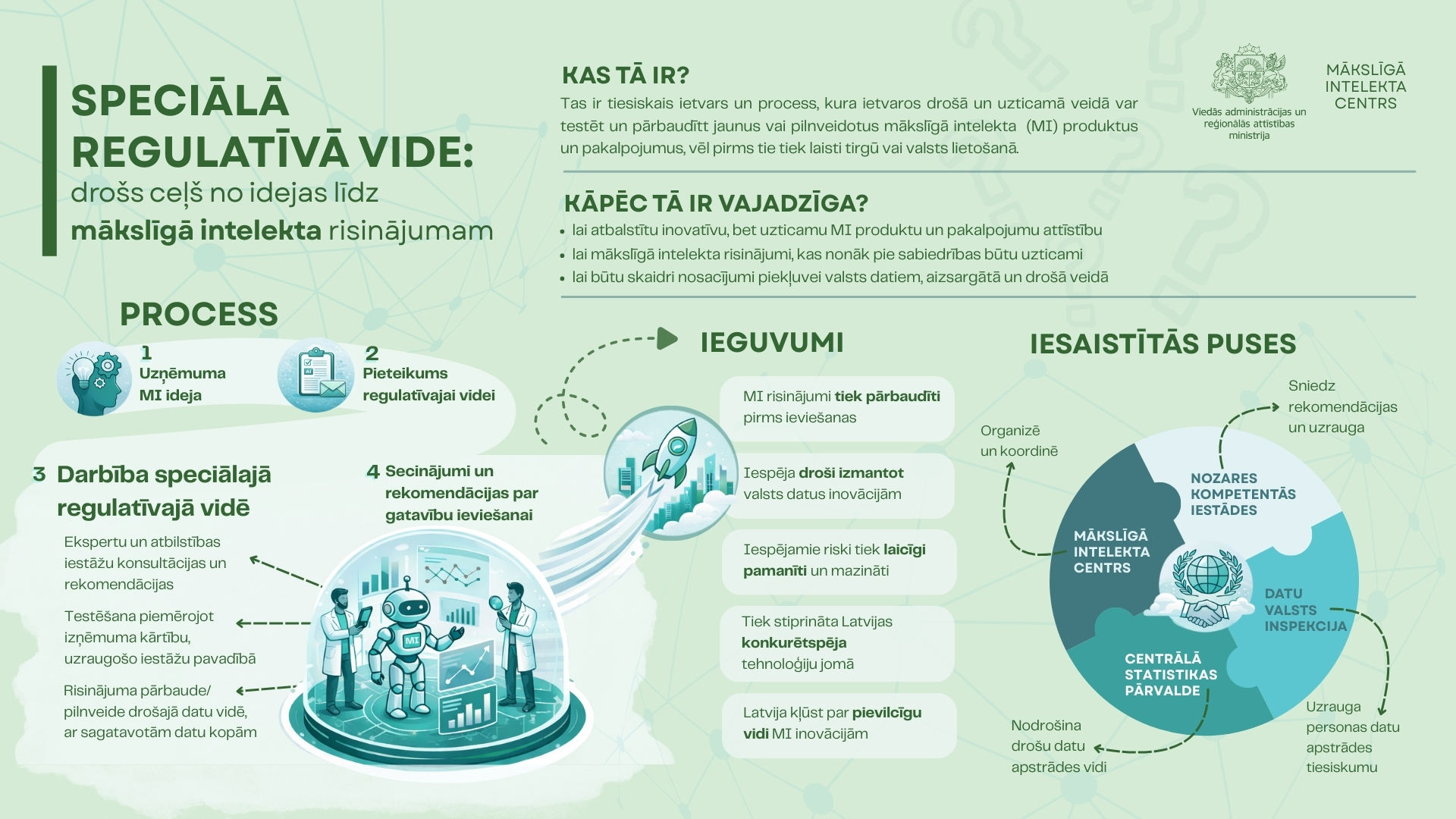 Speciālā regulatīvā vide izveidota kā kontrolēts un drošs ietvars, kas ļauj pārbaudīt jaunus vai būtiski pilnveidotus MI risinājumus pirms to laišanas tirgū vai ieviešanas valsts pārvaldē. Tā nodrošina iespēju testēt inovatīvus risinājumus, vienlaikus saglabājot augstus drošības, personas datu aizsardzības un sabiedrības interešu standartus.