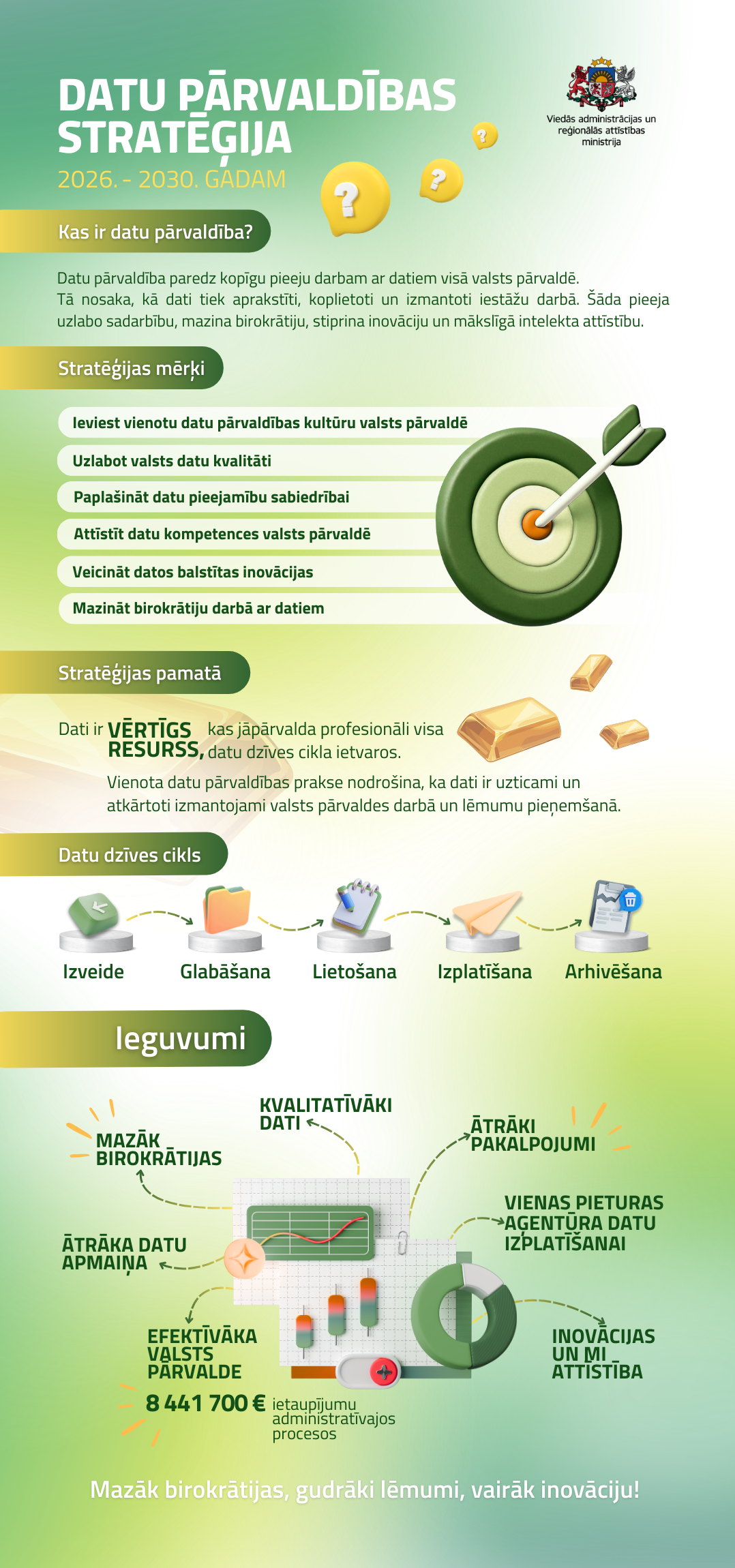 Stratēģijas ieviešana stiprinās valsts pārvaldes spēju efektīvāk izmantot un apmainīties ar datiem, samazinot birokrātiju un uzlabojot pakalpojumu kvalitāti iedzīvotājiem un uzņēmumiem. Tā veicinās vienotu un savietojamu datu apmaiņas risinājumu attīstību, kā arī datu analītikas un mākslīgā intelekta izmantošanu jaunu inovāciju radīšanai. Vienlaikus stratēģija paredz attīstīt datu pārvaldības digitālās prasmes valsts sektorā un uzlabot datu pieejamību sabiedrībai.
