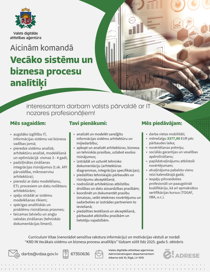 Nosūtot savu pieteikumu uz Valsts digitālās attīstības aģentūru (adrese: Rīga, Alberta iela 10, turpmāk - VDAA), Jūs brīvprātīgi piekrītat, ka VDAA kā pārzinis veiks ar Jūsu pieteikumu saistīto personas datu apstrādi ar nolūku izvērtēt Jūsu atbilstību veicamā darba prasībām, kā arī lai nepieciešamības gadījumā noformētu darba tiesiskās attiecības.